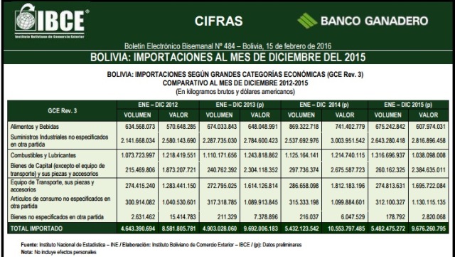 Durante la gestión 2015, las importaciones bolivianas acumularon 9.676 millones de dólares americanos, por la compra de 5,5 millones de toneladas. Las categorías económicas con mayor porcentaje de participación sobre el total fueron: Suministros Industriales con el 29% del total importado; Bienes de Capital (25%) y Equipos de Transporte, sus piezas y accesorios (18%). Hubo un descenso en casi todas las categorías (excepto Artículos de consumo) comparadas con el 2014.