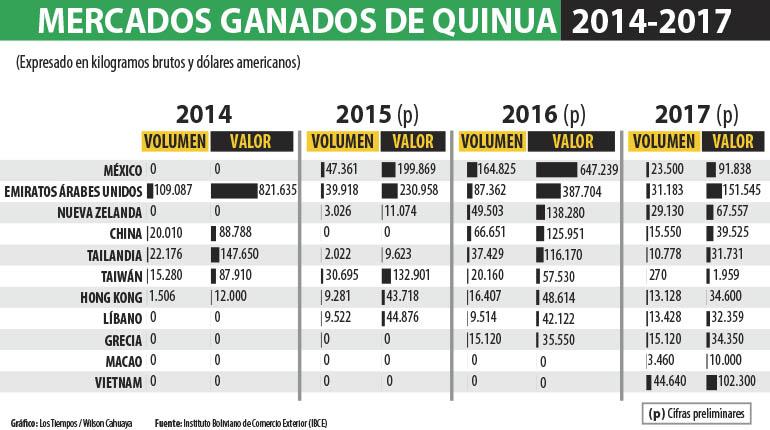 La gestión 2013 fue denominada como Año Internacional de la Quinua, y para el grano boliviano representó el clímax de sus exportaciones. Luego vino el declive, y a partir de ese año, Bolivia perdió 23 mercados internacionales, conservó 21 y ganó 11.